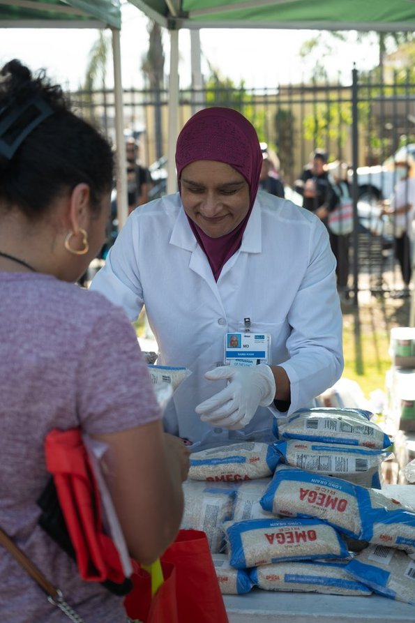 Under Dr. Johnson’s leadership, NEVHC implemented a two-item screening tool to identify patients living in households experiencing food and nutrition insecurity. The establishment of the screening process helped to identify needs and expand resources that were made available to patients, including prescription benefits for eligible patients to buy fresh fruits and vegetables at large chain grocery stores. At her first Champion Provider Fellows meeting, Dr. Khan met Dr. Lena AlSarraf, a Champion Provider Fellowship alum, who told her about a Los Angeles Regional Food Bank project she had hoped to implement during her own Fellowship. This sparked the idea of a mobile food pantry. With help and support from NEVHC, the LADPH and past Fellows, Dr. Khan endeavored to expand food access and helped establish a mobile food pantry in July 2024 at the Sun Valley Clinic in San Fernando Valley. On opening day, more than 300 families – both patients and community members – attended the event to receive non-perishable foods such as beans, rice, and canned vegetables, as well as fresh fruits and vegetables from the Los Angeles (LA) Food Bank. Held monthly on the first Friday of every month, the mobile pantry distributes food and showcases food demonstrations. In the future, Dr. Khan hopes to have food staples available at all clinic sites that are in partnership with the LA Food Bank.