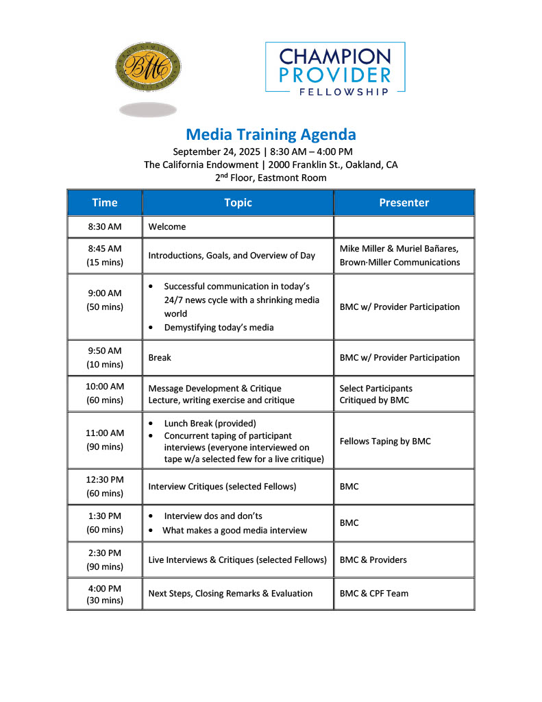 This interactive media training workshop presented by Brown·Miller Communications (9/24/25) included interactive activities, mock interviews and constructive critiques. Fellows learned the differences between various types of media outlets and how to successfully work with each, the qualities that make a story newsworthy, how to craft and deliver a compelling story, and pitfalls to avoid when working with the press.
